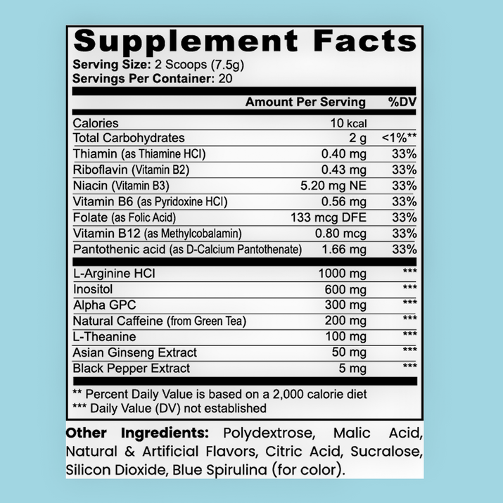 Ingredients: L-Arginine HCl, Inositol, Alpha-GPC, Natural Caffeine (from Green Tea), L-Theanine, Asian Ginseng Extract, Black Pepper Extract, Thiamin (as Thiamine HCl), Riboflavin (Vitamin B2), Niacin (Vitamin B3), Vitamin B6 (as Pyridoxine HCl), Folate (as Folic Acid), Vitamin B12 (as Methylcobalamin), Pantothenic Acid (as D-Calcium Pantothenate), Erythritol, Malic Acid, Natural & Artificial Flavors, Citric Acid, Sucralose, Silicon Dioxide, Blue Spirulina (for color).